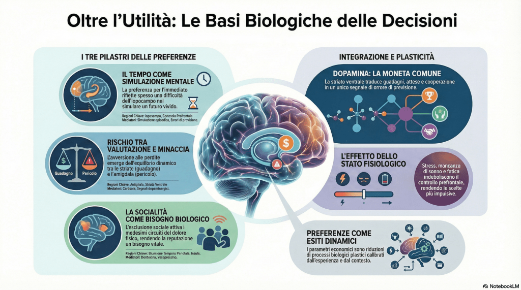 Dal punto di vista biologico, però, questi parametri sono l’espressione comportamentale di sistemi neurali che si sono evoluti per risolvere tre problemi fondamentali: agire nel tempo, apprendere in condizioni di incertezza e coordinarsi con altri individui. Le preferenze non sono quindi oggetti primitivi: sono esiti emergenti di circuiti che integrano apprendimento, segnali corporei, controllo cognitivo e contesto sociale.